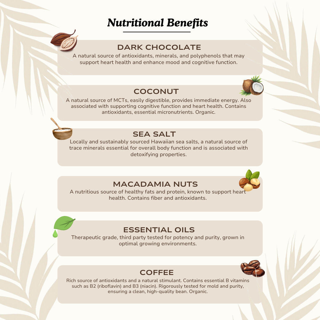 • Dark chocolate (cacao, organic cane sugar, cocoa butter) locally sourced in Hawaii. Made from cacao beans harvested using fair trade practices, sustainably and ethically grown
